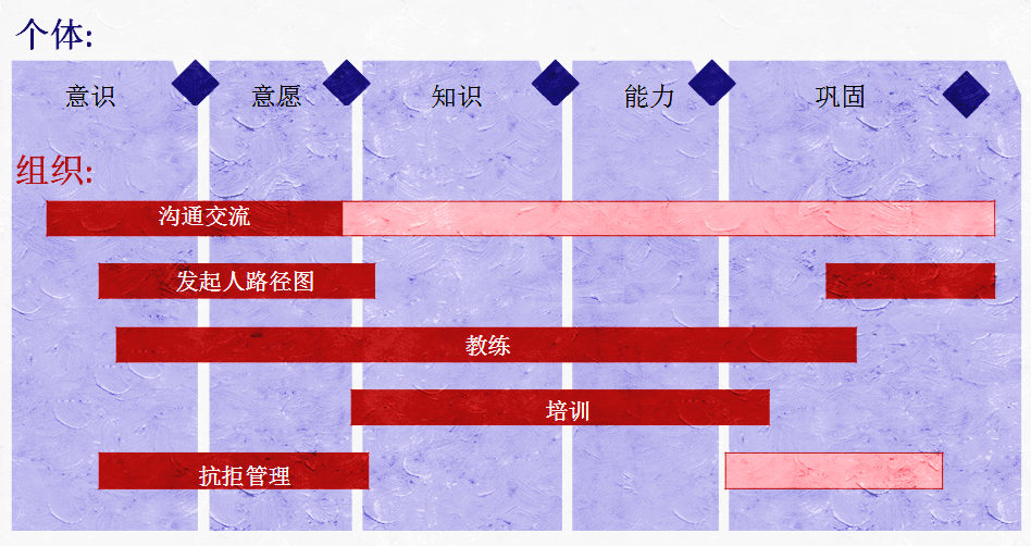 它首先对个体进行现状评估,进而选择相应的干预手段,我们称之为推动变革的杠杆,诸如沟通宣传、发起人路径地图、教练、培训、抗拒管理等