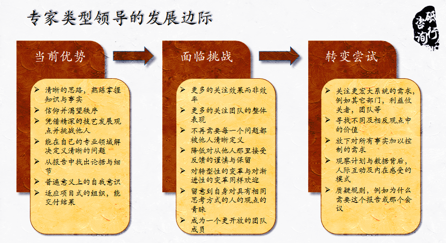在进行了充分交流并结合问卷测评后,我们判断问题根源在于团队成员的心智模式大多处于“专家型”的阶段,他们具有过硬的专业知识,擅长通过提供可信的数据和清晰的思路来取得共识和认同。但他们把协作看成浪费时间,对于专业技能不如自己的人提出的想法不屑一顾。他们认为情商无足轻重,对他人的情绪与感受缺乏敏锐度。